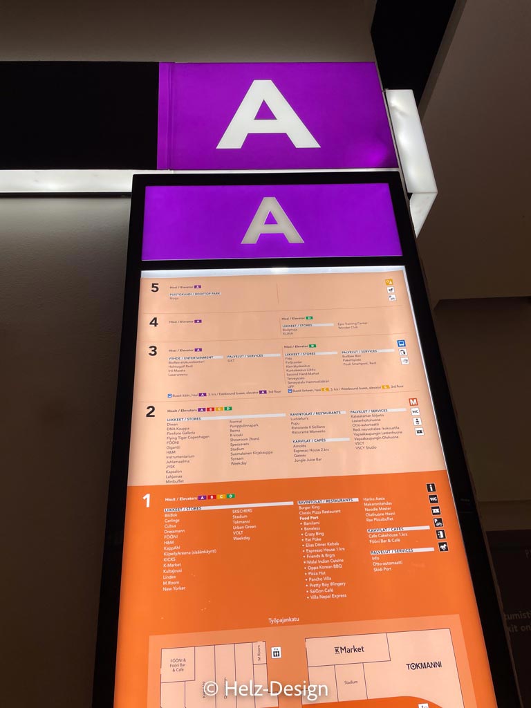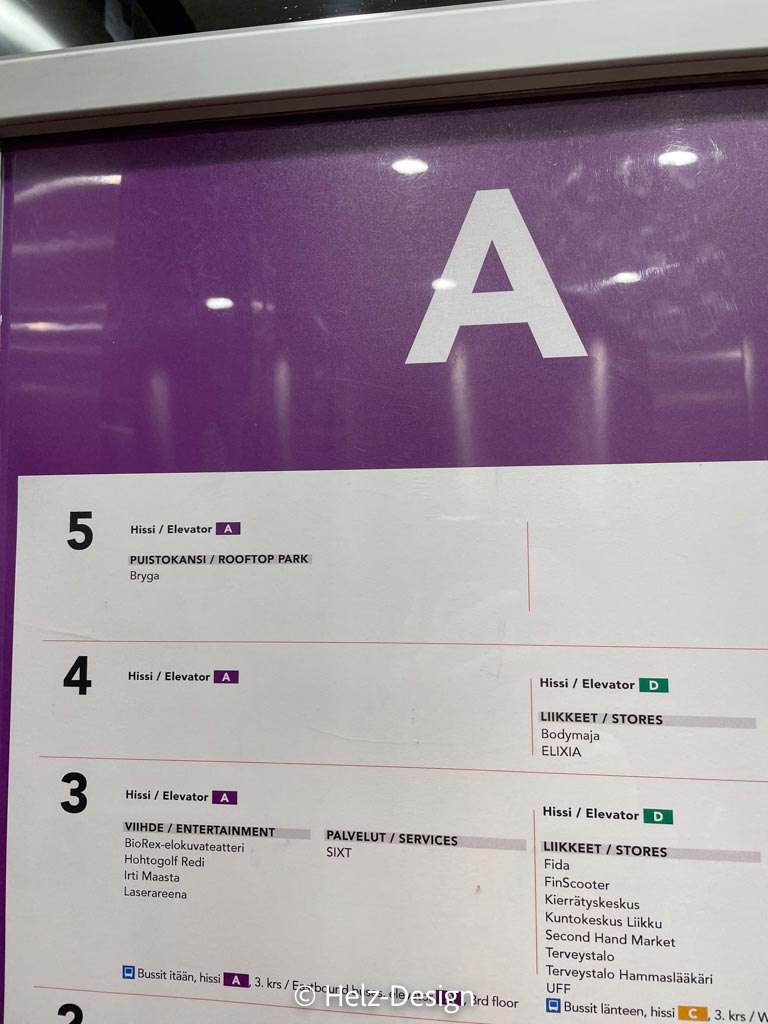 Es gibt dort zwei Bereiche, die durch die durch einen überdachten Weg getrennt sind. Die beiden Bereiche nennen sich Stadi und Sköne. Ich weiß nie, was wo ist. Außerdem gibt es Hinweise für Metro nach Westen (Läneen Metro) und Metro nach Osten Itäinen Metro) und ich bin jedesmal verwirrt. Schlimmer als Rechts und Links, verwechsele ich auch andauernd!